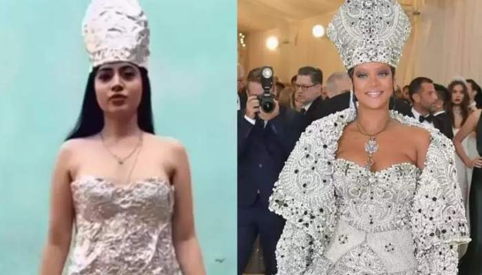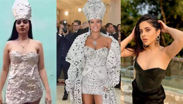 Urfi's foil attire did remind us of pop icon Rihanna's Met Gala look from 2018. The red-carpet event is known for actors and supermodels wearing out-of-the-box stunning outfits. Rihanna wore an off-shoulder short dress with an oversized overcoat in 2018. It was a custom-made, embellished outfit. She also wore an avant-garde crown.